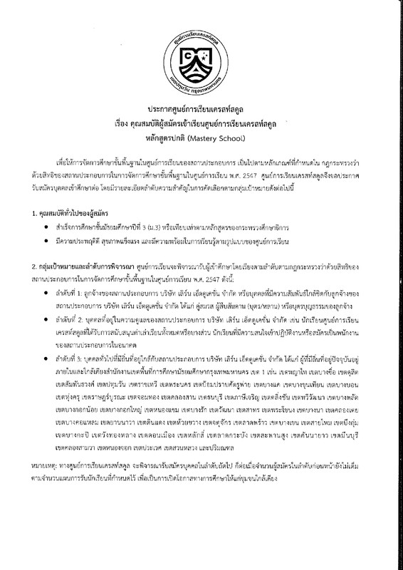 เรื่อง คุณสมบัติผู้สมัครเข้าเรียนศูนย์การเรียนเครสท์สคูล
